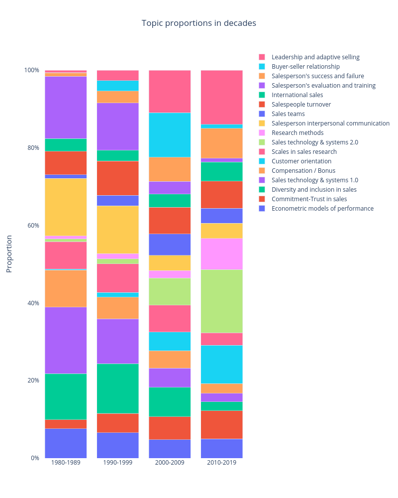 The evolution of topics is presented with (1) annual data and (2) decades. Hover over the charts to get interactive details. You can click on the entries in the legend to switch on/off selected topics.